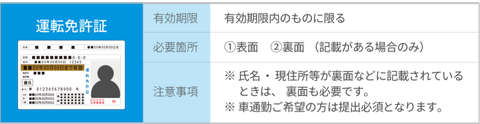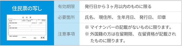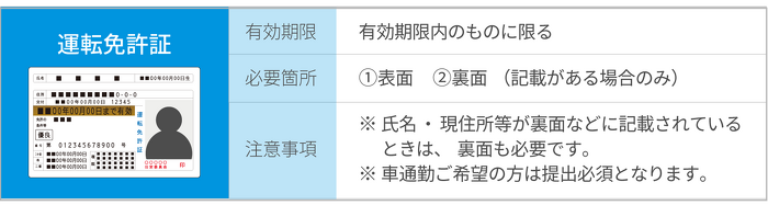 ※ 該当する書類をお持ちでない場合は、電気・⽔道・ガス・電話料⾦等の請求書や領収書(3ヶ月以内に発⾏されたもの)を あわせてご提出ください。